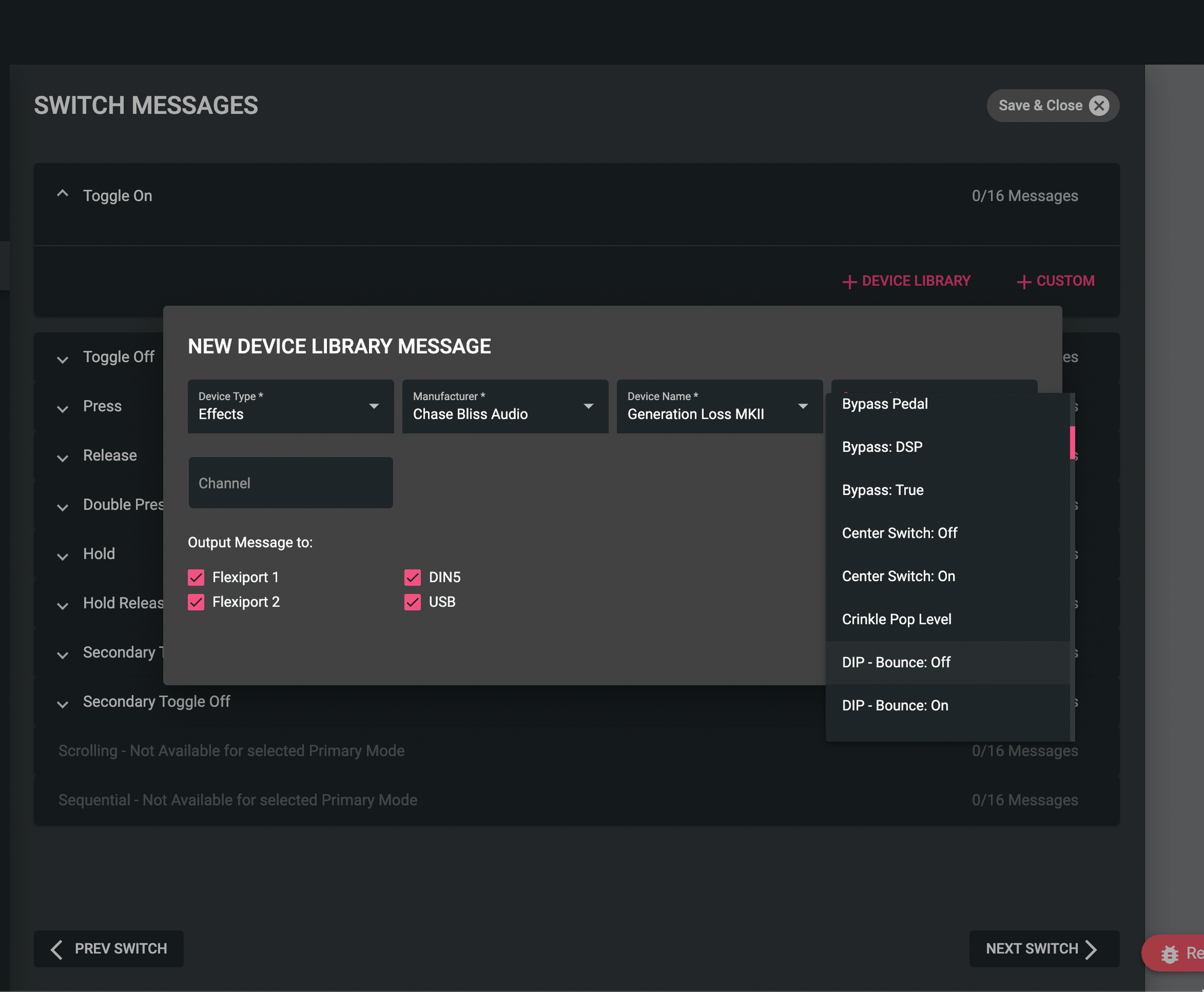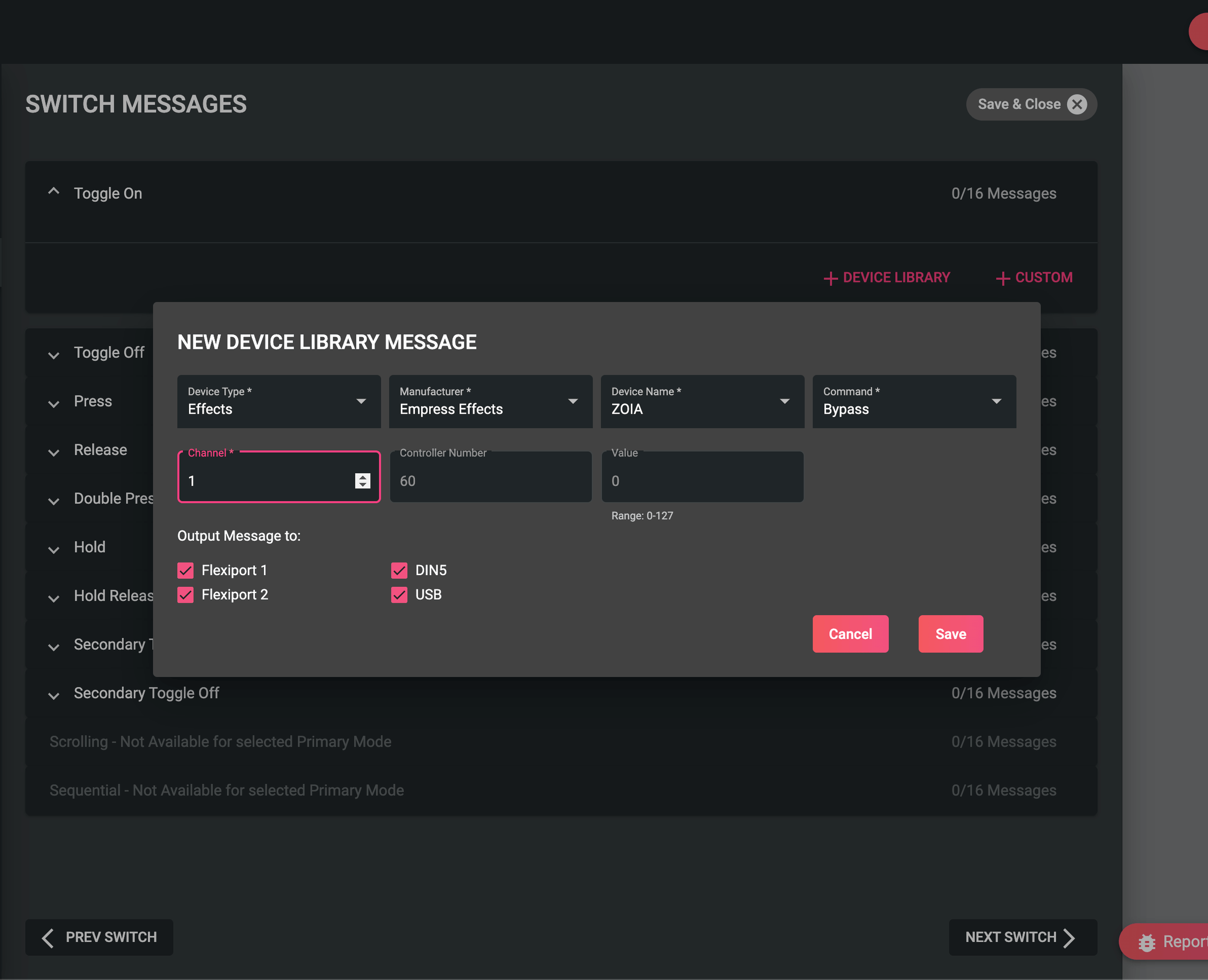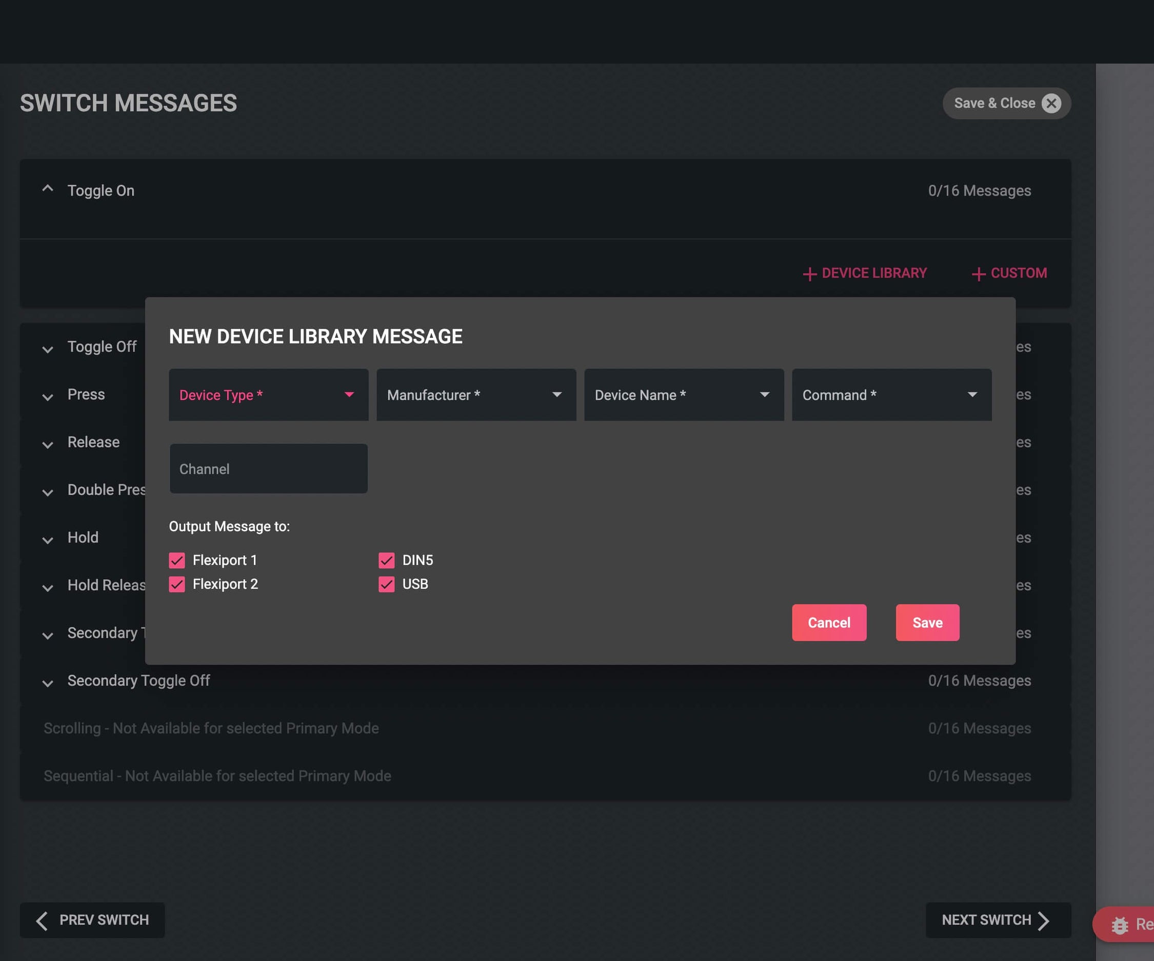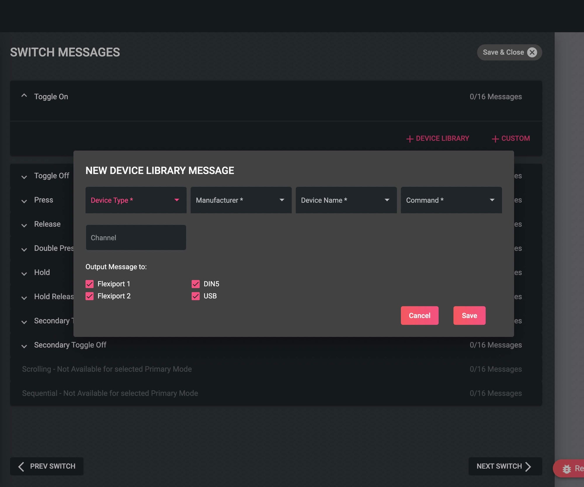 When using our web editor to add messages to your PIRATE MIDI devices, you can add commands directly from our Device Library by choosing the Type>Brand>Product>Command for devices you own.