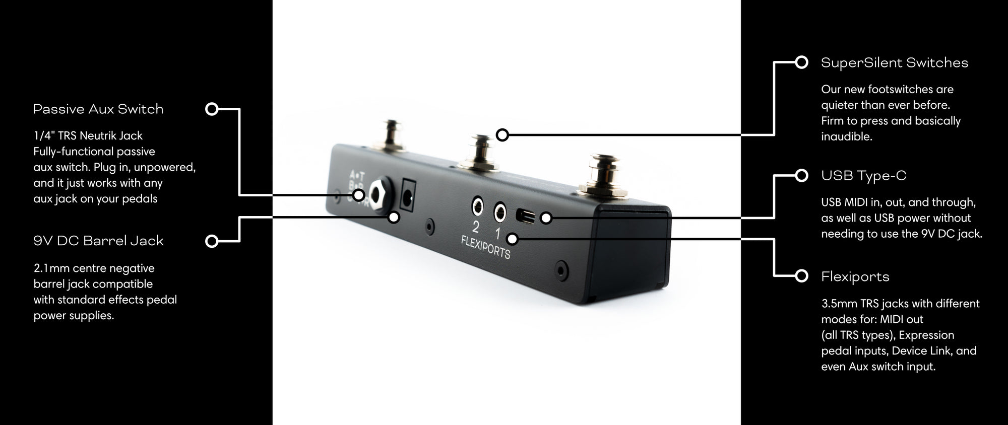 Need a triple aux switch? They're a dime a dozen and a race to the bottom. Aero is something different. Sure, it works as a regular passive aux switch, but we reimagined what you should expect from a compact MIDI solution.